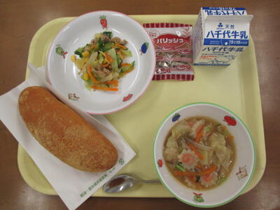 ・牛乳 ・きなこあげパン ・やきにくサラダ ・ワンタンスープ ・パリッシュ
