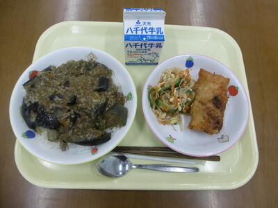 ・牛乳 ・マーボーナス丼 ・手作りキムチ春巻き ・まめもやしとささみの中華和え