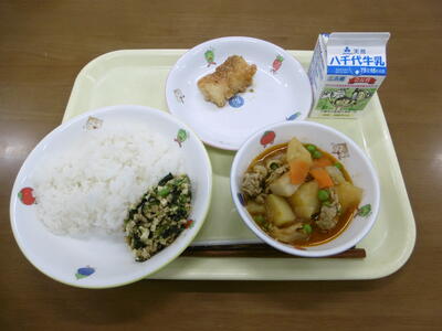 ・牛乳 ・ごはん ・チーズ納豆 ・いかのかりんと揚げ ・インド煮