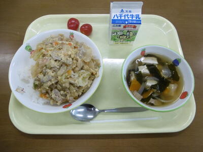 ・牛乳 ・あぶたま丼 ・わかめスープ ・ミニトマト