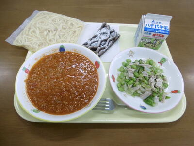 ・牛乳 ・ミートソーススパゲッティ ・枝豆サラダ ・ショコラパイ