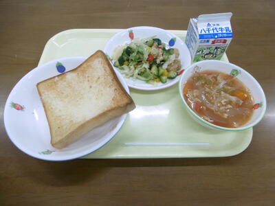 ・牛乳 ・シュガートースト ・さけのコロコロサラダ ・ABCスープ