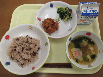 ・牛乳 ・赤飯 ・鶏肉のからげ ・からし和え ・お祝いすまし汁