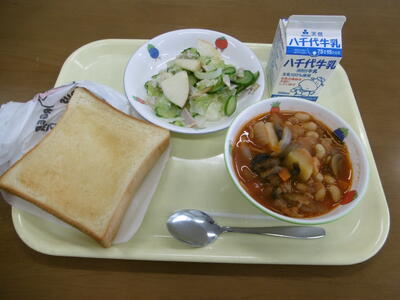 ・牛乳 ・ハニーミルクトースト ・ポークビーンズ ・りんごサラダ