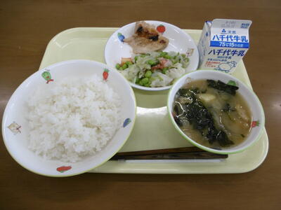 ・牛乳 ・ごはん ・とリのゴマみそ焼き ・枝豆サラダ ・サツマイモみそ汁