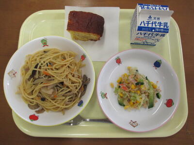 ・牛乳 ・和風キノコスパゲティ ・かにかまサラダ ・手作りマロンケーキ