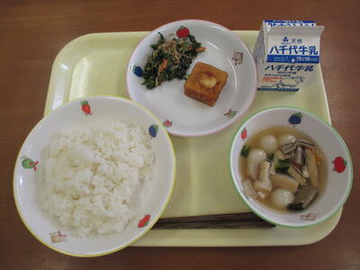 ・牛乳 ・揚げ出し豆腐の薬味ソースがけ ・ゴマ和え ・白玉汁