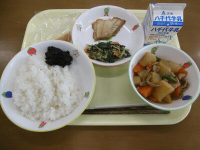 ・牛乳 ・ごはん ・行徳の佃煮 ・赤魚のしょうゆ焼き ・ごま和え ・豚肉と大根の含め煮 ・りんご