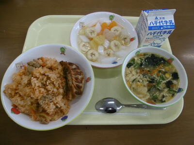 ・牛乳 ・じゃこガーリックピラフ ・あげどりのレモンソースがけ ・りんごのサラダ・野菜のコンソメスープ