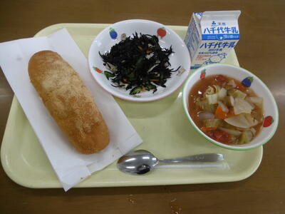 ・牛乳 ・きなこ揚げパン ・ひじきのマリネ ・マカロニ入りトマトスープ