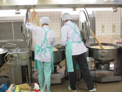 給食室では、たくさんの人の食事を作るので、大きなお鍋で煮物を作ります。
