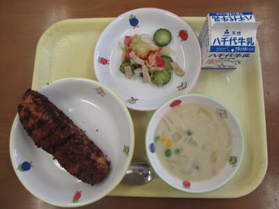 ・ココアあげぱん・クラムチャウダー・フレンチサラダ・ぎゅうにゅうです。