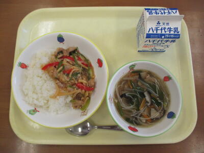 チンジャオロースどん・ビーフンスープ・ぎゅうにゅう です。
