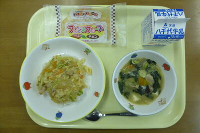 今日の献立は味めぐり北海道です。北海道にちなんだメニューが登場します。あたたかいみそラーメンで体を内側から温めましょう。みそラーメンのスープは濃厚なうまみが出るようになんのだしをとったでしょうか。味わって食材を見つけてください!