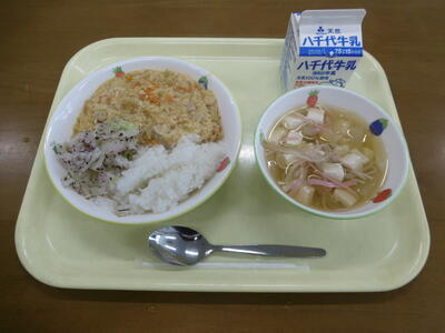 ・牛乳  ・親子丼  ・キャベツのゆかり和え  ・冬瓜のすまし汁