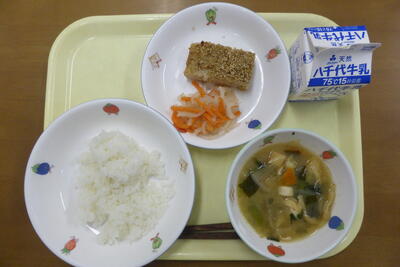 紅白なますについてです。みなさんお正月にはどんな料理を食べましたか。今日の献立は少し遅いのですが年明けということでお正月などのお祝いの時によく食べられる料理にしました。なますは昔、生の魚、だいこん、にんじん、お酢でつくられていました。このことからなますと呼ばれるようになったそうです。にんじんの赤、だいこんの白がお祝いの時につかう水引のようなので縁起のよいといわれる料理のひとつになりました。
