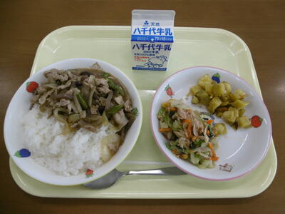 ・牛乳 ・みそ好き丼 ・小松菜とツナのサラダ ・キャラメルポテト