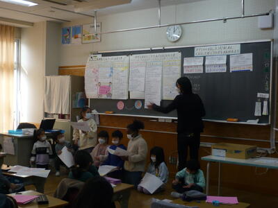 1月24日(火)、第6回校内授業研究会(今年度最終)を行いました。今回は「公開研究会」として、市内の12名の先生方にご参観いただきました。これまで、本校では、「主体的に学ぶ子の育成」を研究主題に掲げ、学習過程に応じた支援の工夫について、「生活科」や「総合的な学習の時間」を中心に、実践的な研究を積み重ねてきました。講師の先生方や参観された先生方からは、子どもたちが問題解決に向けて主体的・協働的に学んでいる姿に、高い評価をいただきました。今後も、「興味関心を持ち、見通しをもって粘り強く学習に取り組む。」「友だちの協働、地域の方々との交流、先人の考え方などを手掛かりに自分の考えを広げ、深める。」「自分の学びを振り返り、次につなげる。」…このような学びの姿を目標に、引き続き、支援の充実に努めてまいります。