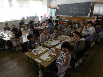 「♬あったかはあとが、パスポート♪」校歌のBGMが流れる中、全校で「あったかはあと給食」を実施しました。普段は、学級ごとに食べている給食ですが、この日は、異年齢の子どもたちが、ペア学年(6年生と1年生、5年生と3年生、4年生と3年生)ごとに、会食しました。楽しいおしゃべりに、給食のハヤシライスがいつもにも増して、さらにおいしく感じます。準備や後片付けでは、上級生が下級生をリードする姿も頼もしいです。おなかがいっぱいになった昼休みは、ペア学年での遊びに夢中!特に、1年生は6年生のお兄さん、おねえさんに遊んでもらって、大喜びでした。