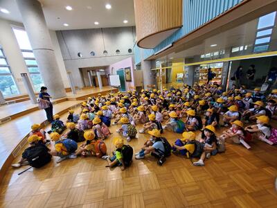 入り口から、エスカレーターで下へ降りていきます。他の学校の子もたくさんいます。迷子にならないでね…