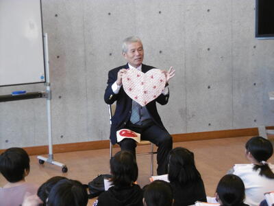 創立25周年を迎えた今年度、5年生では総合的な学習の時間に、妙典小学校についての探究学習をしています。母校とはいえ、知っているようで知らない謎がいっぱい!子どもたちは、その謎を解明しようと、これまで、校舎をデザインした設計士の中島さんや前校長の田中先生をお招きして、お話を伺ってきました。さらに、12月8日には、初代校長の横田先生にもお越しいただきました!写真でしか見たことがない校長先生の登場に、子どもたちは、拍手喝采!大興奮!もちろん、校歌を作詞した先生だということは、みんなが知っています。横田校長先生が、やさしいまなざしと笑顔で、開校当時の地域や学校の様子はもちろん、「あったかはあと」の意味や由来、校歌に込めた思いや願いなどを、詳しくお話してくださいました。初代校長先生とのあったかはあとな交流に、子どもたちは、母校への愛情をいっそう深めたことでしょう。
