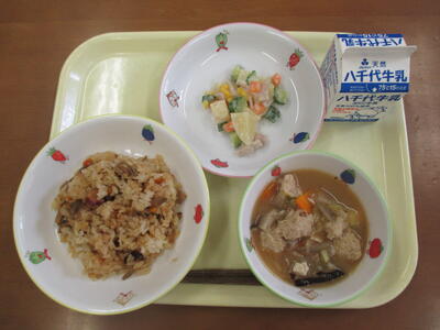 ・たこめし・とりつくねじる・マセドアンサラダ・ぎゅうにゅう です。