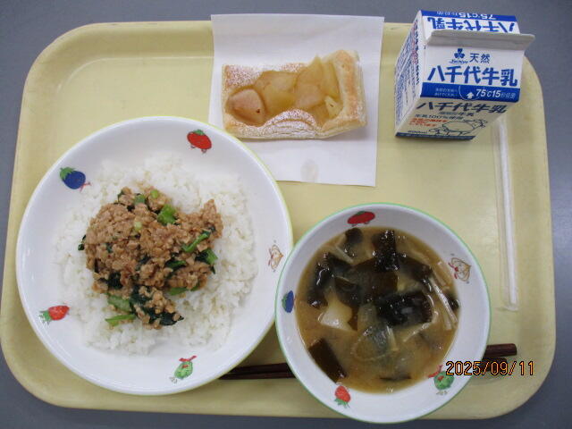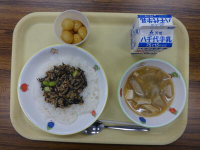 今日の献立は、ごはん、肉みそひじき丼、みぞれ汁、くだもの(りんご)、牛乳です。
