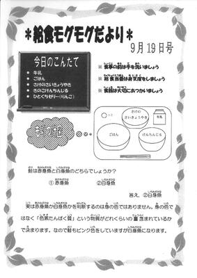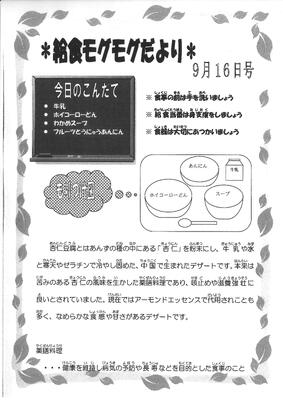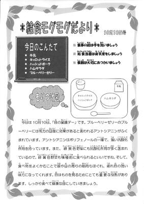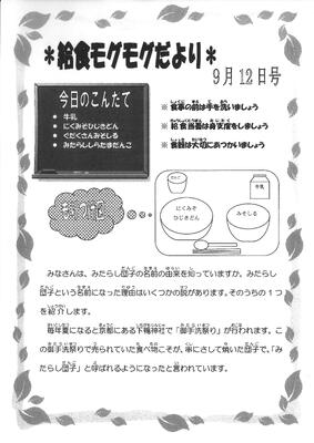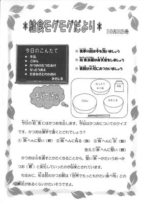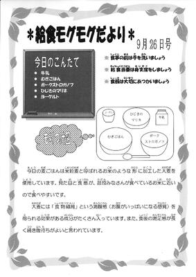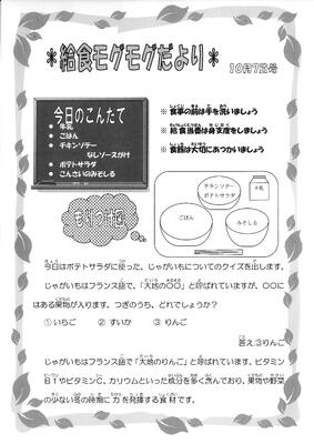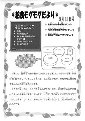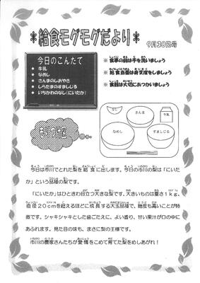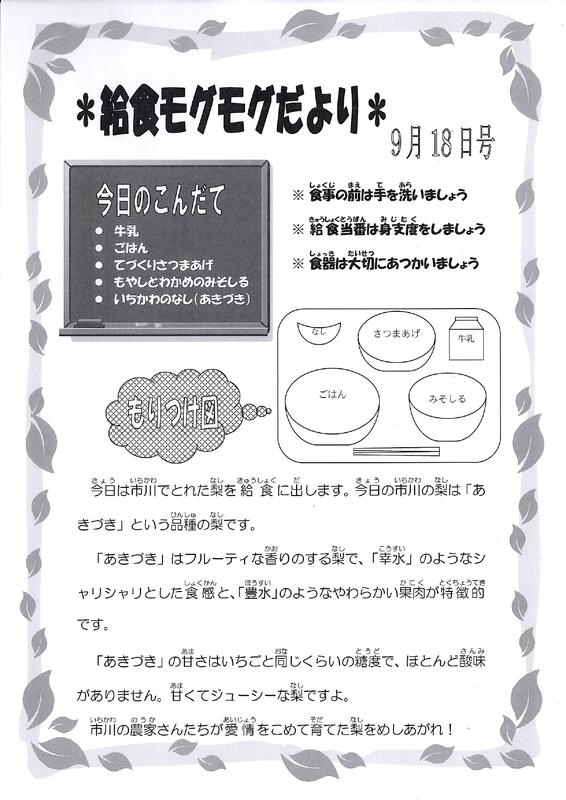 本日の献立は、手作りさつま揚げ、ごはん、もやしとわかめの味噌汁、市川のなし(あきづき)、牛乳です。