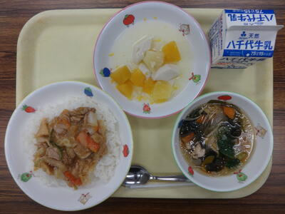 今日の献立は、ホイコーロー丼、わかめスープ、フルーツ豆乳杏仁、牛乳です。