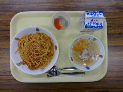 今日の献立は、ミートソーススパゲティ、コンソメスープ、モザイクゼリー、牛乳です。