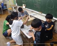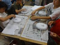 4年生 図工 お面づくり お面の芯となる部分に和紙をのり付けしています。その後、新聞を貼るなどして、徐々に、形が作られていきます。