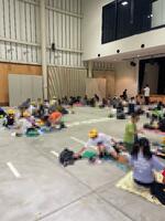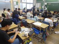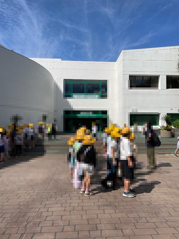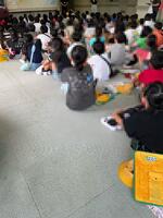 博物館前で、クラス写真撮影後、日差しが強いので、体育館で昼食です。