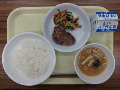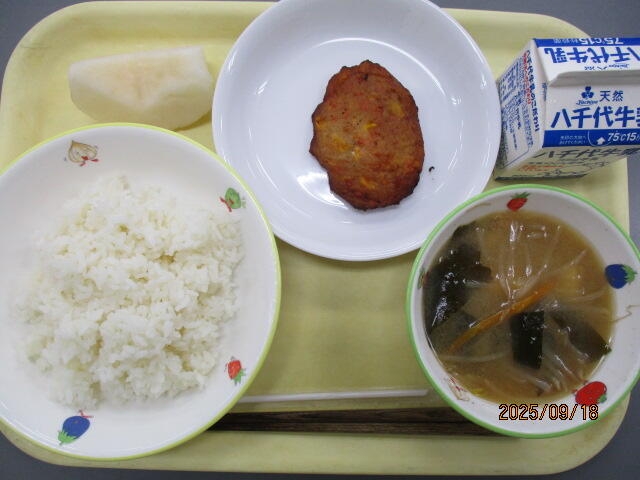 本日の献立は、れんこんハンバーグ、青菜とコーンのおかか和え、ごはん、もやしの味噌汁、牛乳です。