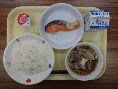 今日の献立は、鮭の西京焼き、きのこけんちん汁、ごはん、一口ゼリー、牛乳です。