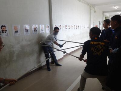 視野が制限された中でテントを歩行する難しさを学ぶものです。実際には有毒ガスが含まれていたり熱を帯びていたりと想像しながら行うこともアドバイスされました。