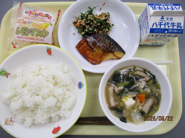 本日の献立は、ご飯、納豆和え、さばの塩こうじ焼き、そうへいじる、マフィン、牛乳です。