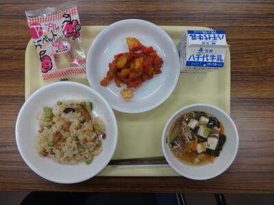 今日の献立は、ひじきご飯、ししゃものから揚げ、大根と生揚げのそぼろ煮、りんご、牛乳です。