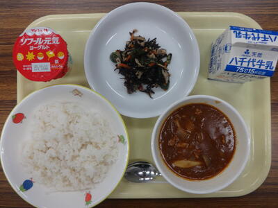 本日の献立は、豆とひき肉のカレー、ごはん、ひじきのマリネ、牛乳です。