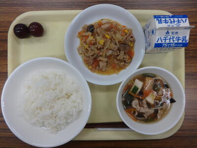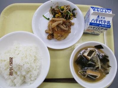 今日の献立は、豚肉ときのこの炒め物、ごはん、ニラの中華スープ、ぶどう、牛乳です。