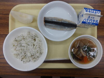 今日の献立は、さんまの塩焼き、磯和え、ごはん、大根の味噌汁、牛乳です。