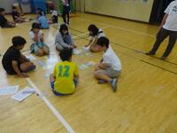1年生 体育 体育館で、2チーム分かれて、投げるを楽しんでいます。