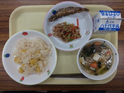 今日の献立は、ツナチャーハン、しゅうまい、ゆで野菜サラダ、牛乳です。