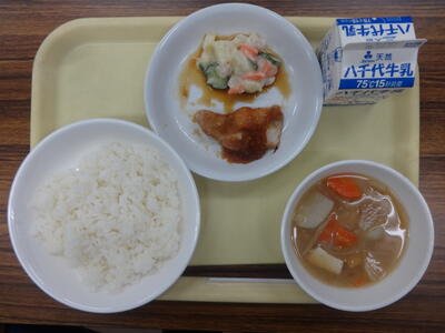 今日の献立は、かつおの竜田揚げ、納豆和え、ごはん、玉ねぎとわかめの味噌汁、牛乳です。