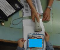 図書 貸し出し作業をスムーズするため、本を重ねて、バーコードを読み取りやすくしています。