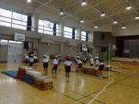 体育 主になる運動につながるような動きを取り入れた、準備運動をしています。