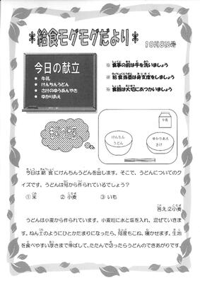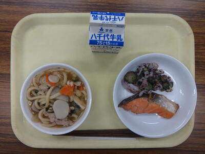 今日の献立は、鮭の幽庵焼き、ゆかり和え、けんちんうどん、牛乳です。