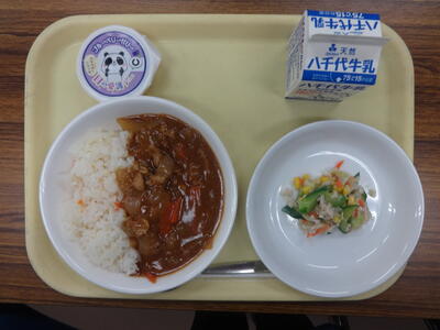 今日の献立は、うずらこっカレーライス、ウズラのたまご、鶏肉のコロコロサラダ、牛乳です。
