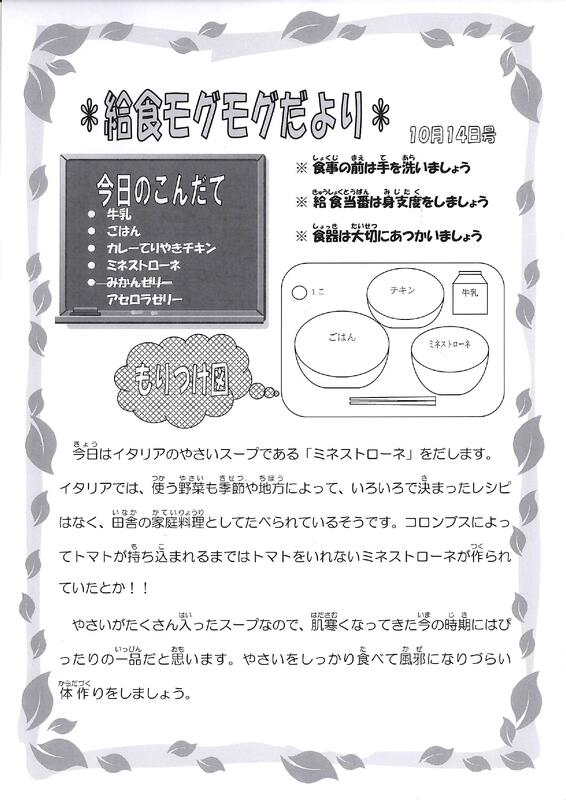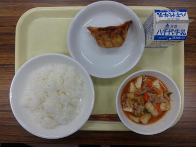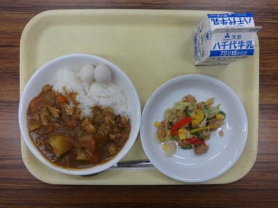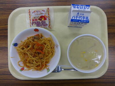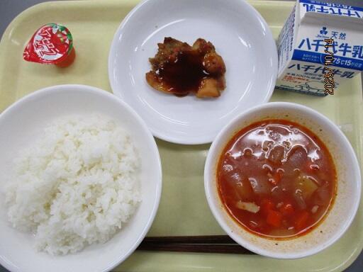 今日の献立は、カレー照り焼きチキン、ミネストローネ、ごはん、アセロラゼリー、牛乳です。