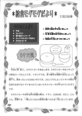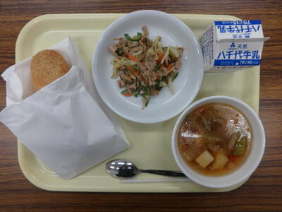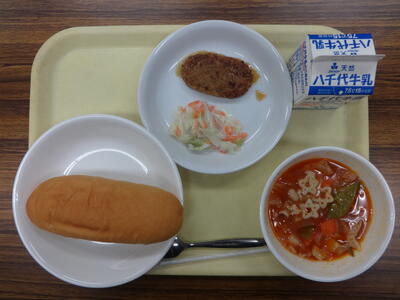 今日の献立は、コッペパン、照り焼きハンバーグ、キャベツのレモンマヨ和え、ミネストローネ、牛乳です。