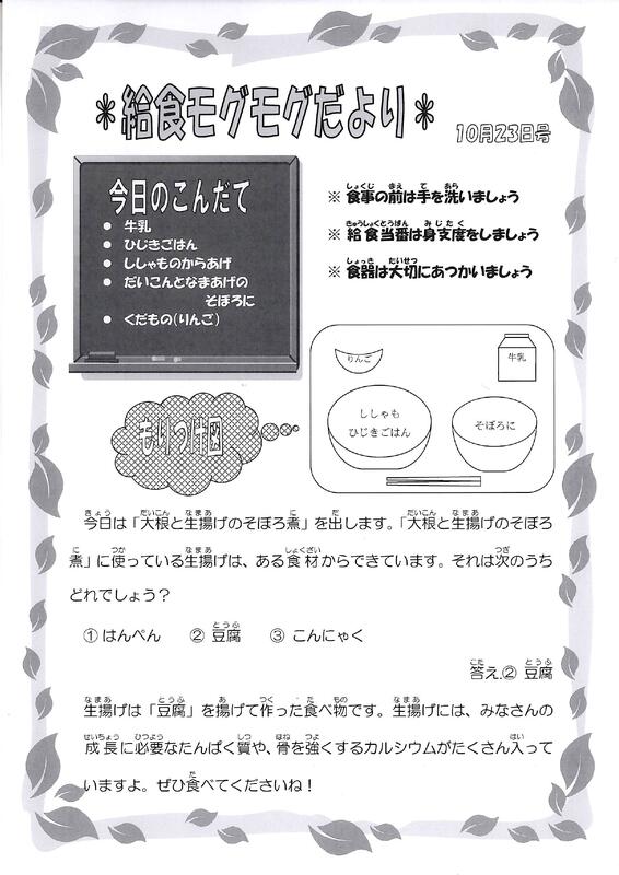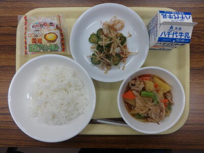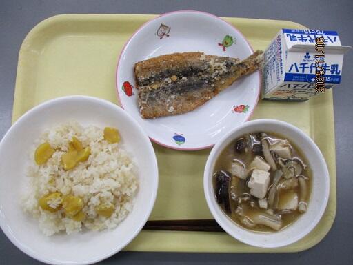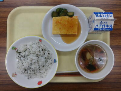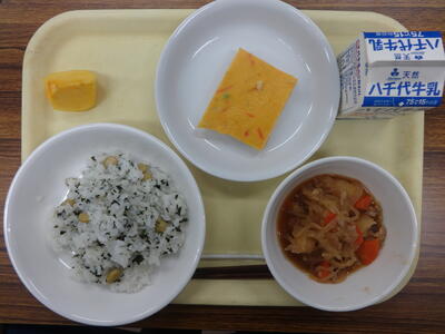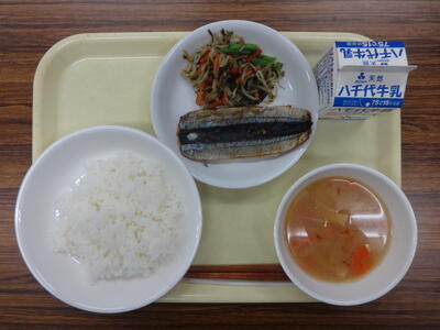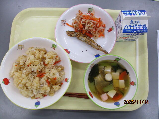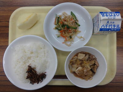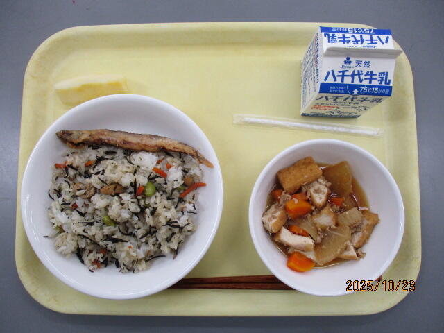 今日の献立は、ひじきご飯、ししゃものから揚げ、大根と生揚げのそぼろ煮、りんご、牛乳です。